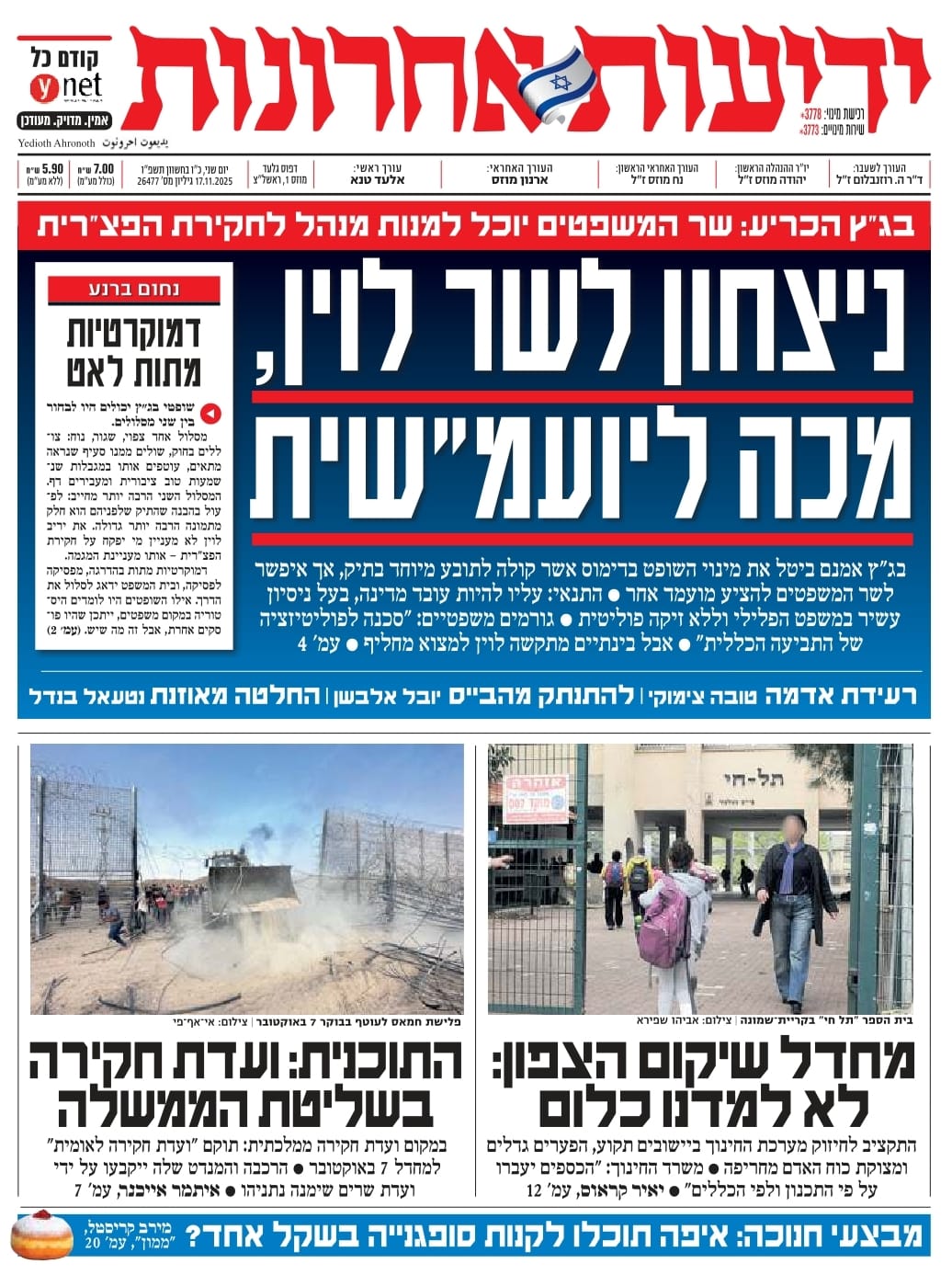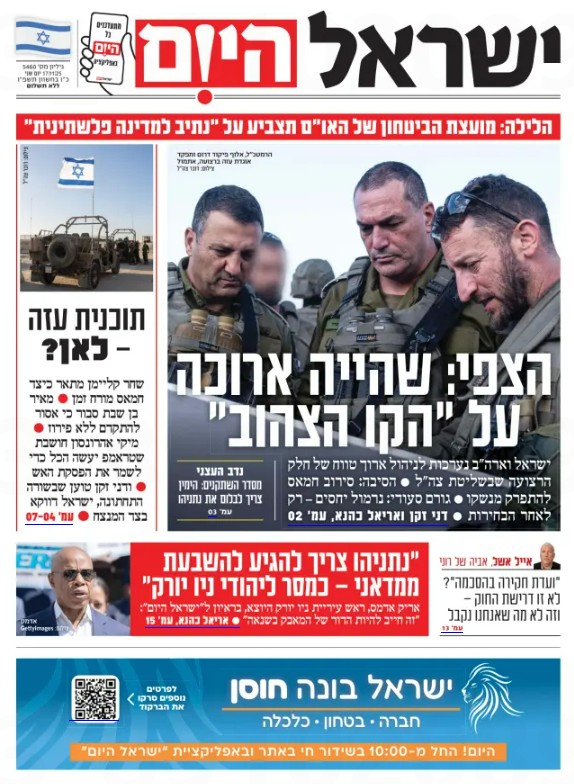 Interprétation : Hamevaser adopte un ton alarmiste et met l’accent sur les risques géopolitiques plutôt que sur les débats politiques internes. Le journal insiste sur la possibilité que les tractations entre Washington et Riyad affaiblissent l’avantage stratégique d’Israël, en particulier dans le domaine aérien et nucléaire. Une lecture sécuritaire classique, centrée sur la vulnérabilité régionale et la nécessité de préserver la supériorité militaire israélienne.