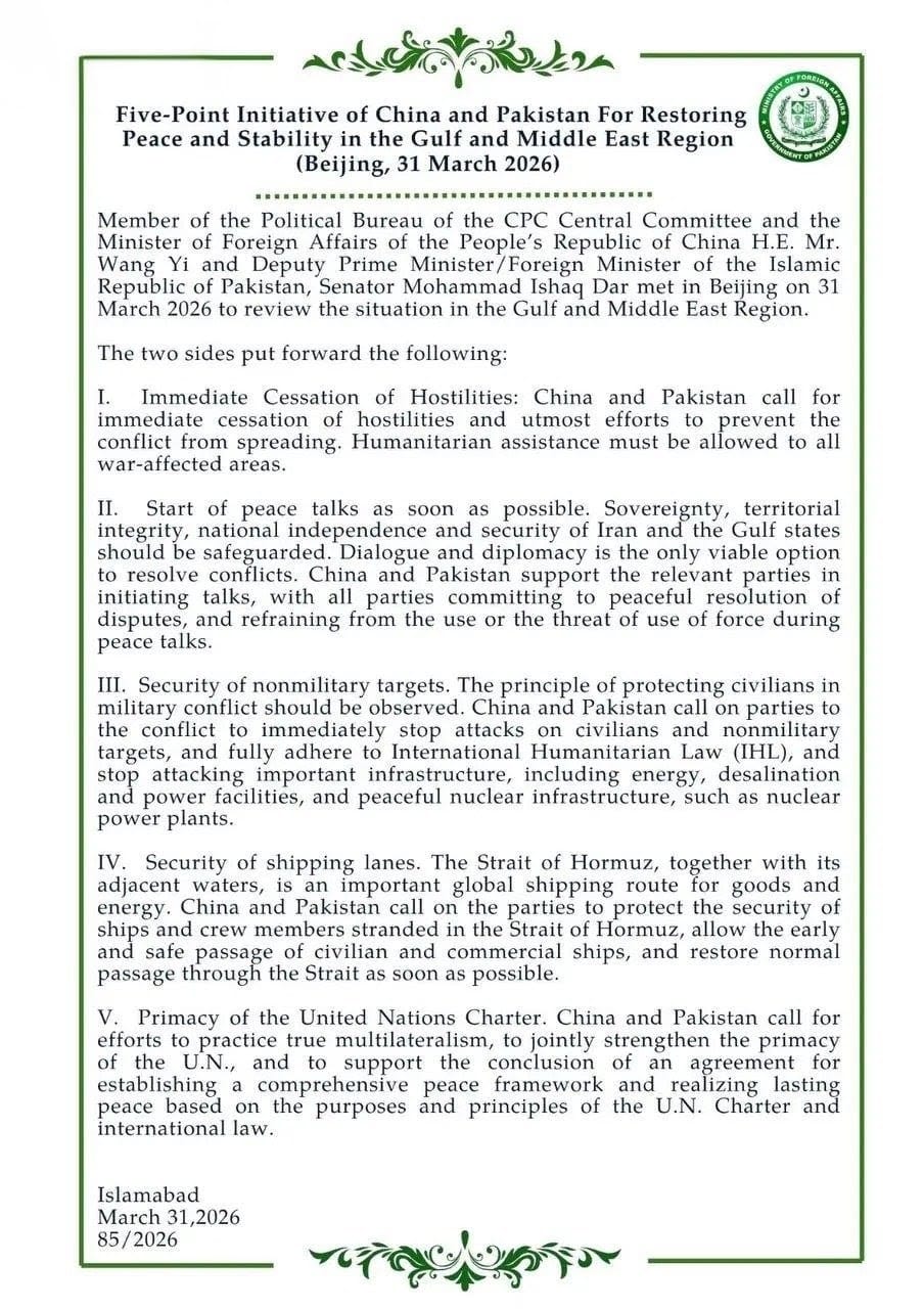 La Chine et le Pakistan ont présenté mardi 31 mars à Pékin une initiative commune pour tenter de mettre fin à la guerre avec l’Iran. Selon Reuters, ce plan en cinq points appelle à un cessez-le-feu immédiat, au lancement rapide de négociations, à l’arrêt des frappes contre des cibles non militaires, à la reprise de la navigation dans le détroit d’Ormuz et à un accord fondé sur les principes de la Charte des Nations unies.