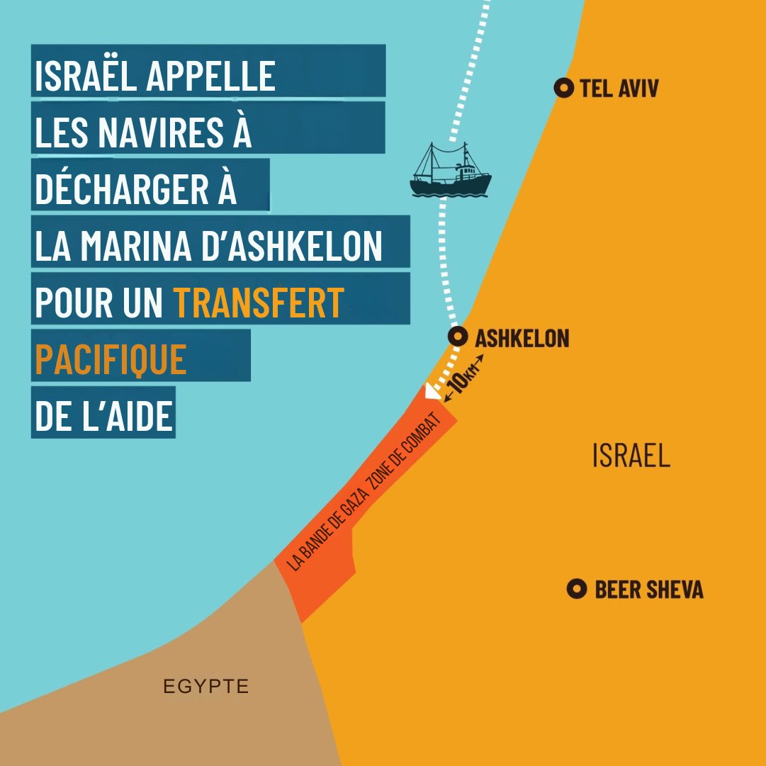 Israël, de son côté, a proposé à l'équipage de la flottille d'accoster à Ashkelon, d'y décharger l'aide humanitaire qui sera ensuite acheminée en toute sécurité dans la Bande de Gaza. Les participants ont refusé et ont décidé de poursuivre leur route vers la Bande de Gaza. ''La flottille du Hamas refuse la proposition d’Israël de décharger l’aide pacifiquement à la marina voisine d’Ashkelon. Elle choisit au contraire la voie illégale — pénétrer dans une zone de combat et violer le blocus naval légal. Cela révèle leur véritable objectif : servir le Hamas plutôt que d’apporter de l’aide aux civils de Gaza. Aide humanitaire — oui. Soutien au Hamas — non'', a tweeté le ministère israélien des Affaires étrangères.