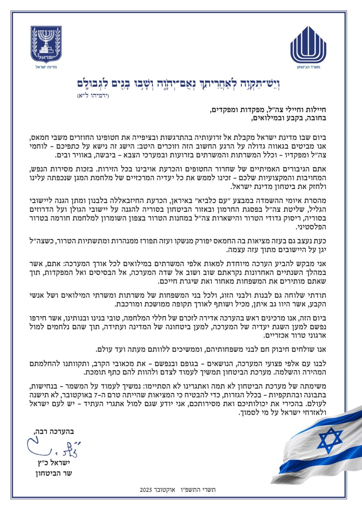 Le ministre de la Défense Israël Katz a adressé ce lundi matin une lettre officielle aux soldats de Tsahal - réguliers, permanents et réservistes - à l’occasion de la libération des otages détenus par le Hamas.
