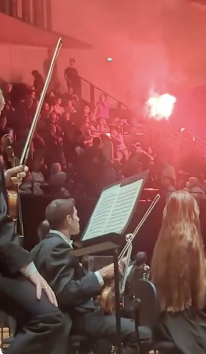Sous les cris et la fumée, plusieurs spectateurs ont paniqué. Les musiciens, visiblement bouleversés, ont été contraints de quitter la scène. Après quelques minutes d’interruption et sous les applaudissements du public resté sur place, l’orchestre est revenu jouer — geste d’une dignité rare dans un climat de haine décomplexée.