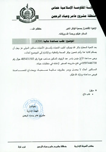 Parmi les cas les plus marquants : 15 000 dollars ont été alloués par Koafel Al-Kheir pour achever la construction d’un centre d’entraînement du Hamas, des milliers de colis alimentaires ont été financés pour des membres de la branche armée, un autre document montre une demande officielle du Hamas à l’association pour apporter une aide financière à l’un de ses militants, évoquant des « difficultés économiques ».