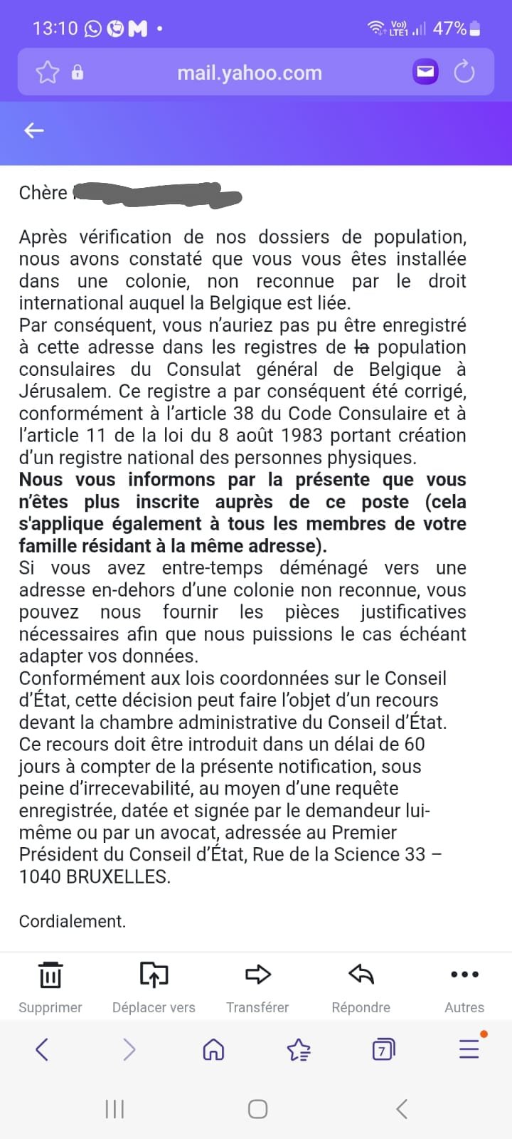 Dans un mail publié sur les réseaux sociaux par son avocat, Me Julien Cohen, il lui est expliqué que compte-tenu de son adresse le consulat de Belgique à Jérusalem n'est pas compétent pour lui délivrer un passeport et qu'elle et sa famille sont rayées des registres de population du consulat.