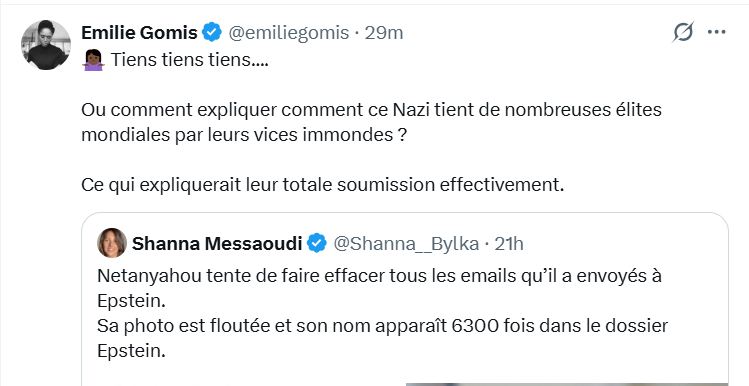 Un peu plus tôt, elle a partagé un tweet affirmant que le nom de Netanyahou figure 6300 fois dans les documents Epstsein et elle en conclut en parlant du Premier ministre israélien: ''Tiens tiens tiens.... Ou comment expliquer comment ce Nazi tient de nombreuses élites mondiales par leurs vices immondes ? Ce qui expliquerait leur totale soumission effectivement''.