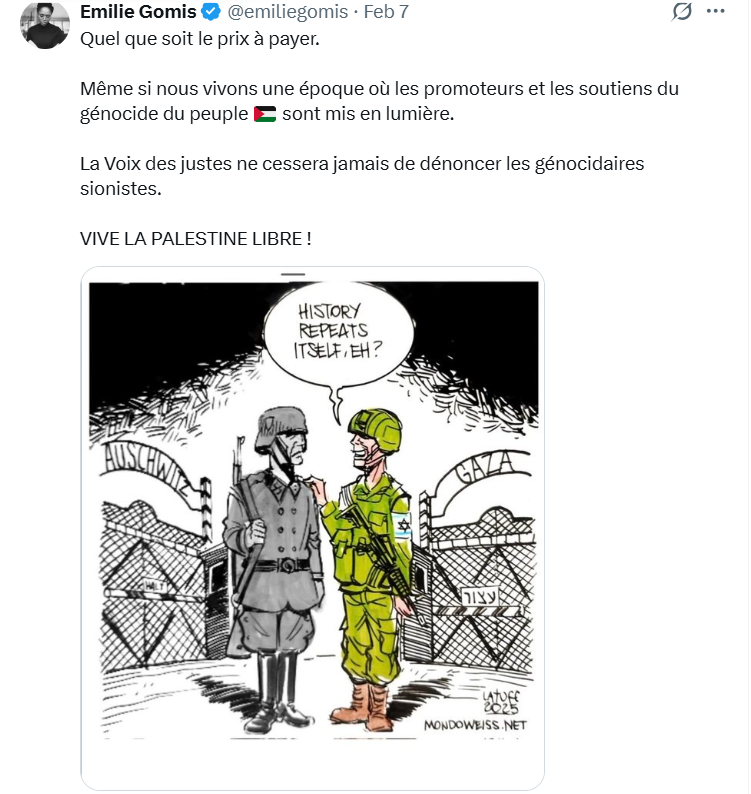 Ces tweets ne sont qu'un échantillon de tout le contenu anti-israélien que produit Emilie Gomis dans lequel d'ailleurs elle n'écrit jamais le nom ''Israël'' mais ''Entité sioniste''.