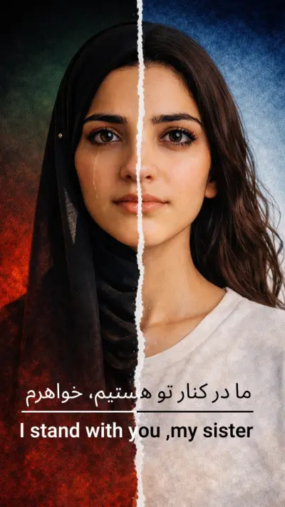 Dans une autre création, une jeune Israélienne et une jeune Iranienne apparaissent côte à côte sous l’inscription : « Je me tiens à tes côtés, ma sœur », en hébreu et en anglais.