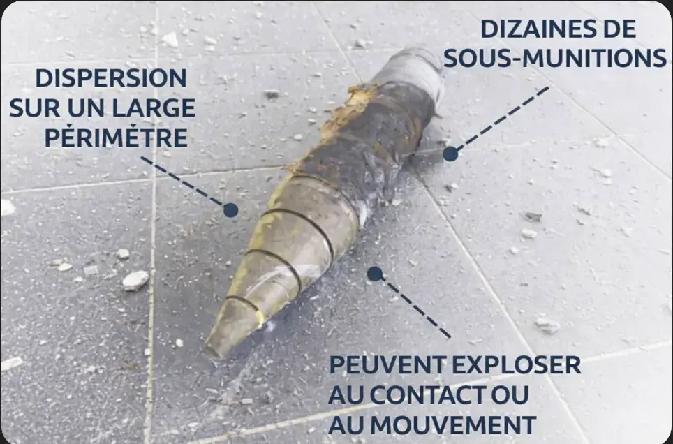 Une partie de ces sous-munitions n’explose pas immédiatement. Elles restent au sol sous forme d’engins non explosés qui peuvent agir comme des mines improvisées, susceptibles de se déclencher au contact humain.