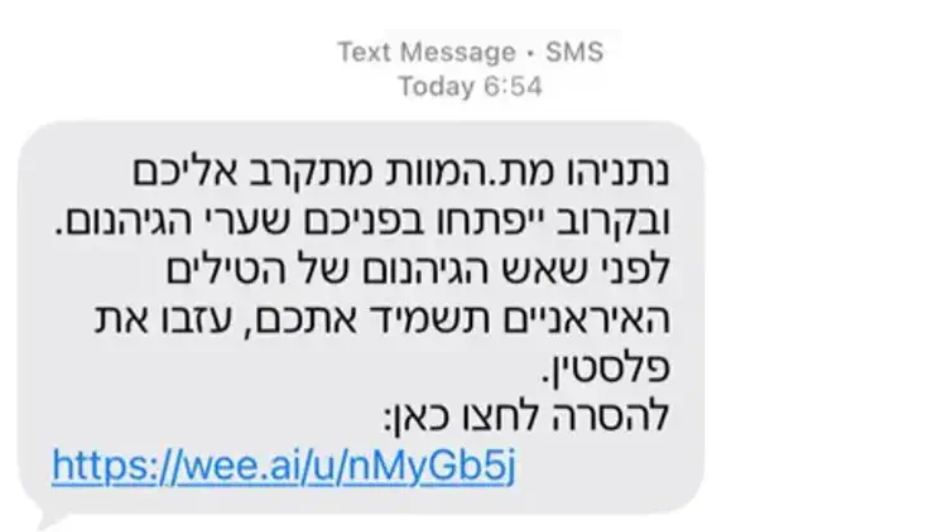 Dans le même temps, d'autres messages, prétendument envoyés au nom des Gardiens de la Révolution iraniens, semaient la terreur avec des menaces explicites et des injonctions à partir: ''Netanyahou est mort. La mort se rapproche de vous et bientôt les portes de l'enfer s'ouvriront sur vous. Avant que le feu de l'enfer des missiles iraniens ne vous anéantissent, quittez la Palestine (sic)''.