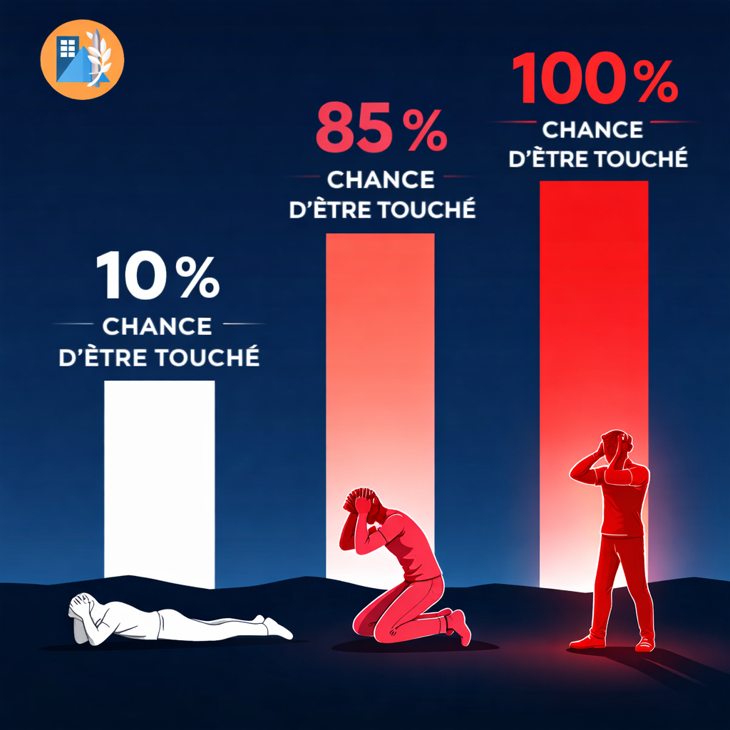 La raison est physique : la grande majorité des fragments projetés par une explosion se dispersent en trajectoire horizontale, à hauteur du corps humain. Plus la silhouette est basse, moins elle offre de surface exposée. Le schéma présenté résume le principe en trois niveaux de risque : debout, le danger est maximal ; accroupi, il diminue légèrement ; allongé, il chute de façon significative.