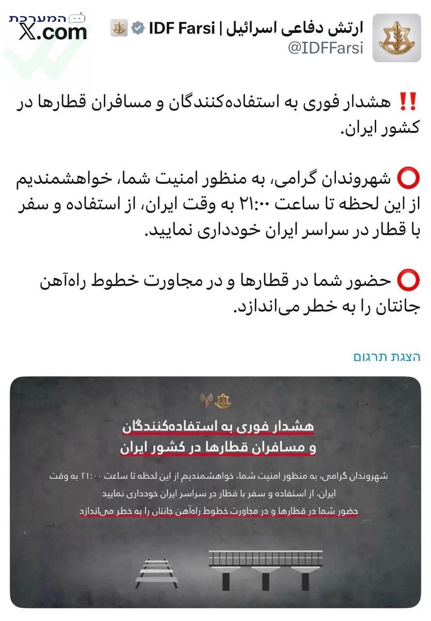 Tsahal a diffusé mardi un message inhabituel à destination de la population iranienne, en appelant les civils à ne plus utiliser les trains ni à s’approcher des voies ferrées à travers tout le pays jusqu’à 21h, heure locale iranienne. Le message, relayé en persan, présente cette consigne comme une mesure de sécurité destinée à protéger les habitants.