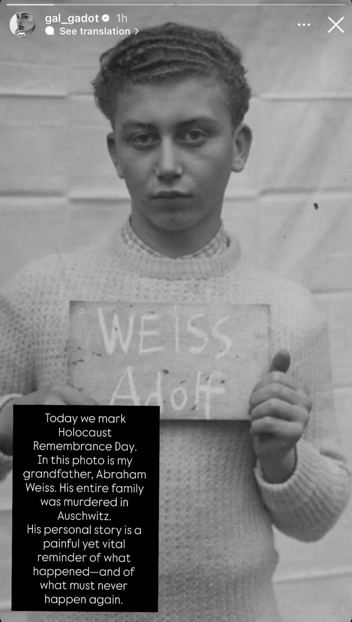 À l'occasion de Yom HaShoah, l'actrice israélienne Gal Gadot a transformé son compte Instagram en tribune mémorielle. Face à ses quelque 105 millions d'abonnés, la star de Wonder Woman a publié une photo de son arrière-grand-père, Avraham Weiss, survivant de la Shoah, accompagnée d'un message sobre mais poignant : « Toute sa famille a été assassinée à Auschwitz. Son histoire personnelle est un souvenir douloureux mais essentiel de ce qui s'est passé - et ne doit plus jamais se reproduire. »