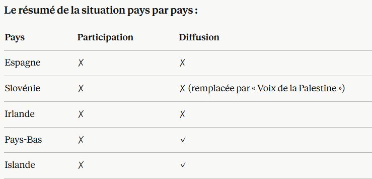 À l'inverse, les Pays-Bas et l'Islande, qui ont également renoncé à envoyer un représentant à Vienne en signe de protestation contre la participation israélienne, ont choisi de continuer à diffuser l'Eurovision pour leur public.