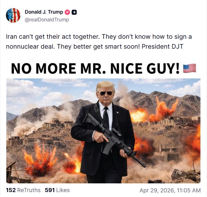 La diplomatie selon Donald Trump. Le président américain a publié ce mercredi matin sur son réseau TruthSocial une image générée par intelligence artificielle le représentant tenant une arme, accompagnée d'un message à l'adresse de Téhéran.